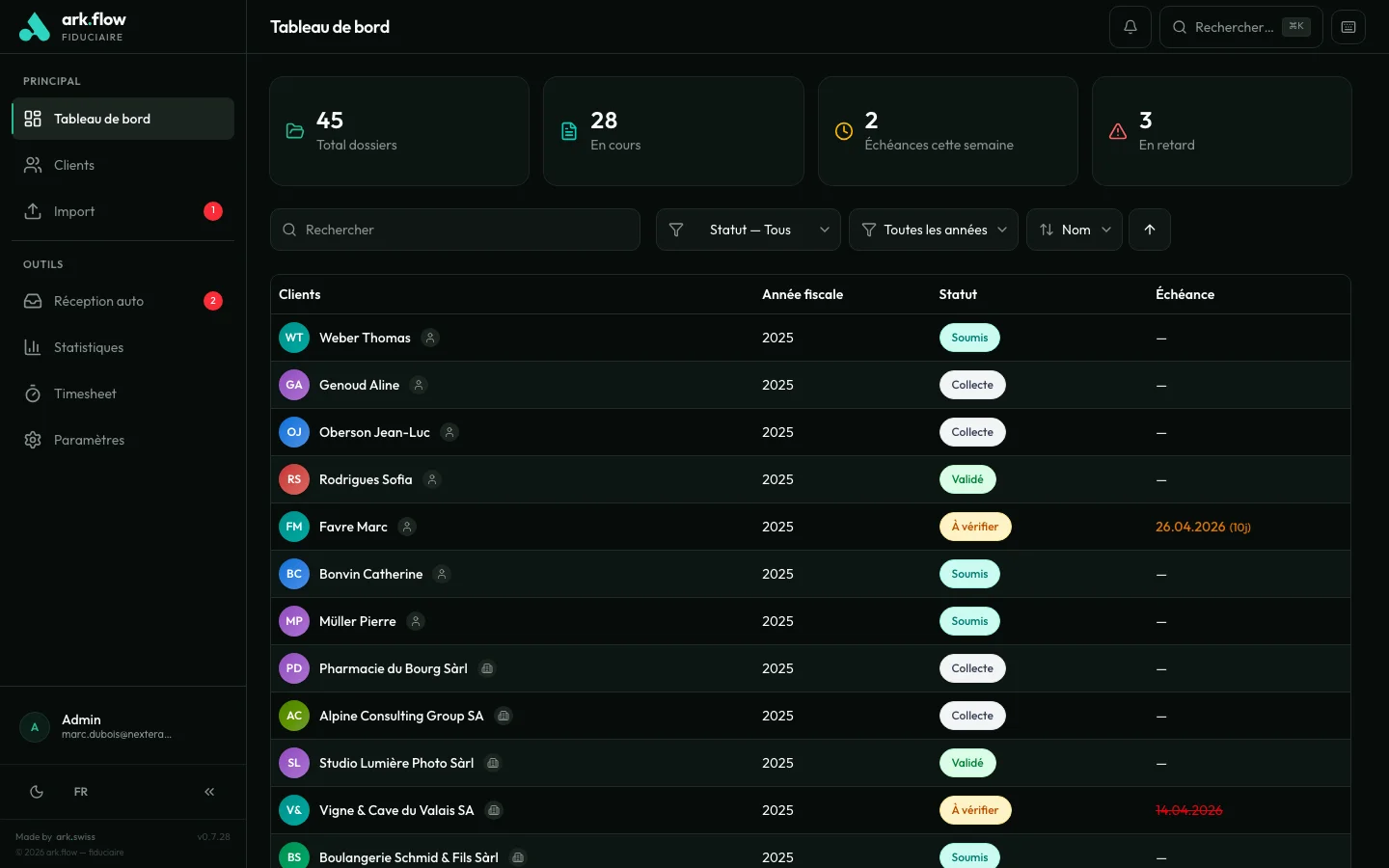 Le socle obligatoire de votre fiduciaire : gestion des clients, import Dr.Tax en un clic, classement intelligent des documents et réception automatique par email. 5 utilisateurs inclus, dossiers illimités, hébergé en Suisse.
