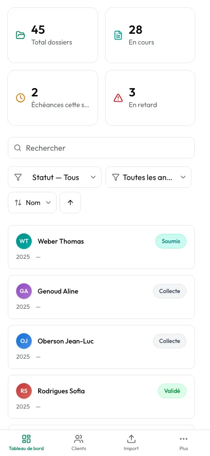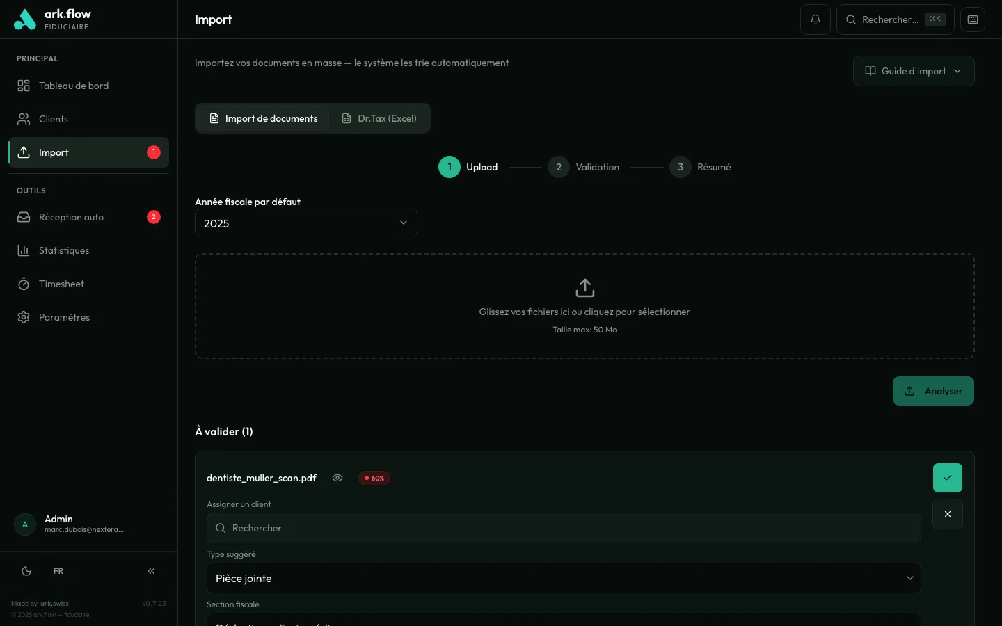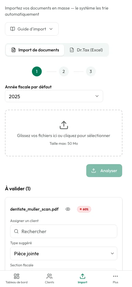 Glissez vos fichiers Dr.Tax dans la zone d'import. Le système reconnaît chaque document, rattache le bon client et la bonne année fiscale. Vous ne corrigez que ce qui reste.