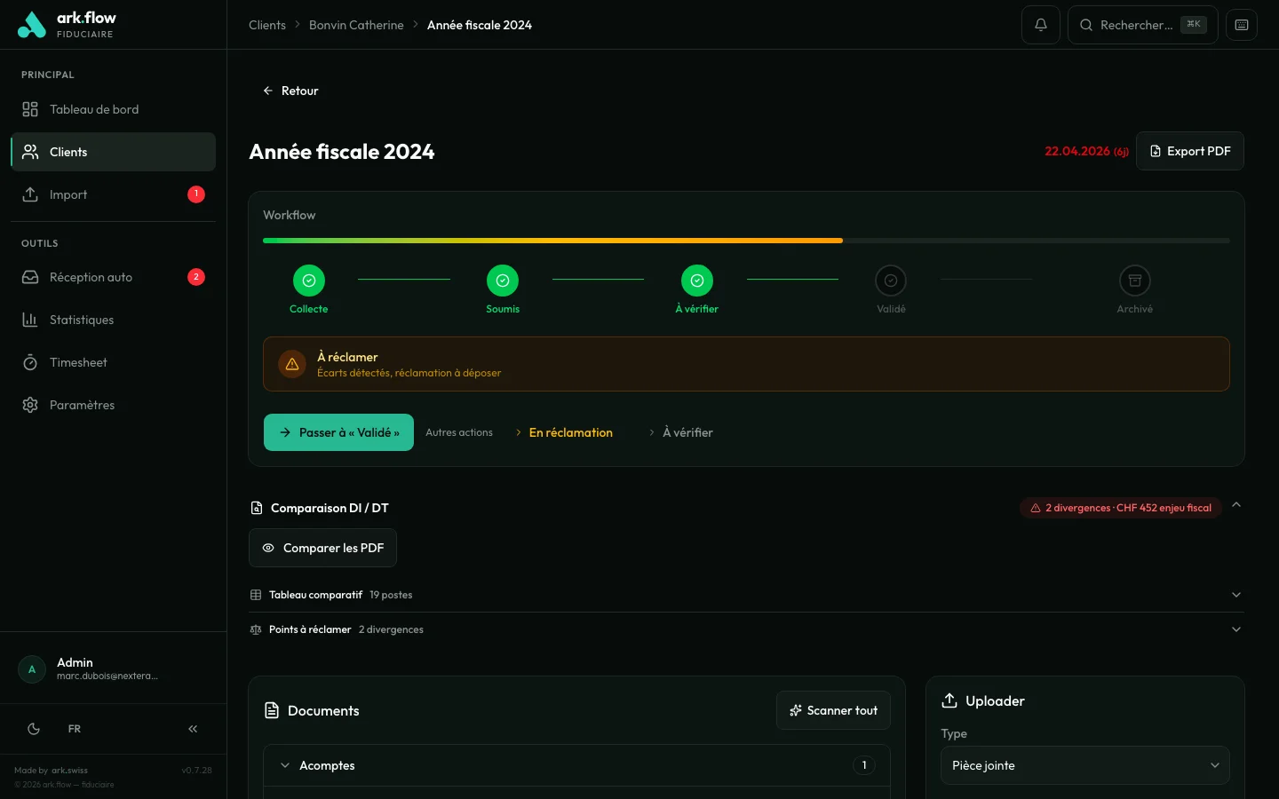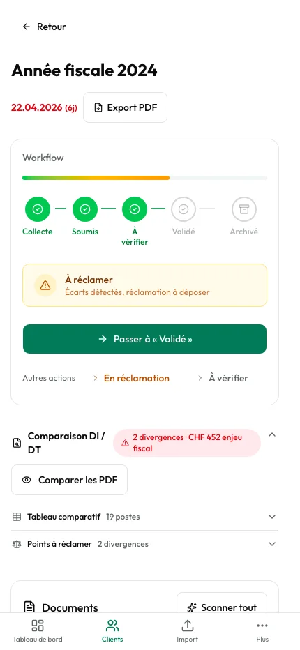 Le système lit la décision de l’autorité fiscale, la compare avec la déclaration et vous montre directement les différences en francs. Plus besoin de relire ligne par ligne pour repérer une correction à contester.