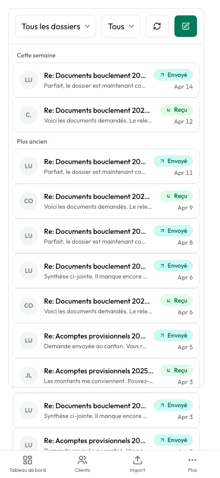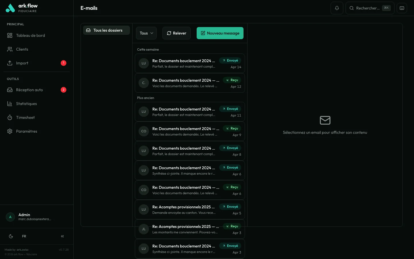 Connectez les boîtes mail de votre cabinet. Consultez et répondez aux emails de vos clients sans quitter ark.flow. L’IA résume les échanges et vous aide à rédiger vos réponses.